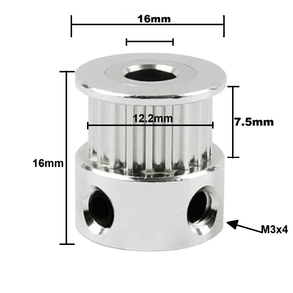 Fabricadas en aluminio, estas poleas son compatibles con correas dentadas GT2 de 6 mm y cuentan con 20 dientes, doble flange y un paso de diente de 2 mm. Su ajuste preciso se logra mediante dos tornillos prisioneros Allen M3, asegurando una fijación firme en ejes de 5 mm de motores paso a paso Nema 14 o Nema 17\. Al utilizar estas poleas, se logra una precisión excepcional en el movimiento, eliminando cualquier inconveniente asociado al Backlash.