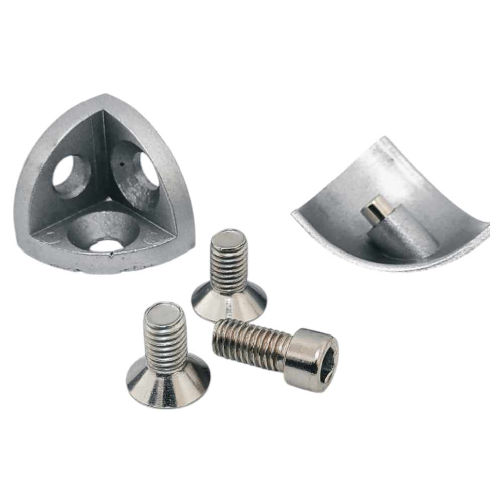 La unión semi esféricas para perfiles T-Slot semicirculares es un componente diseñado para conectar tres perfiles perpendicularmente, permitiendo la construcción de estructuras resistentes y precisas. Su diseño optimiza la distribución de carga y proporciona una fijación estable sin comprometer la rigidez del ensamblaje. Para su correcta instalación, es necesario mecanizar una rosca en el orificio central de los extremos de cada perfil, lo que facilita el montaje mediante tornillería y asegura una conexión firme y segura.